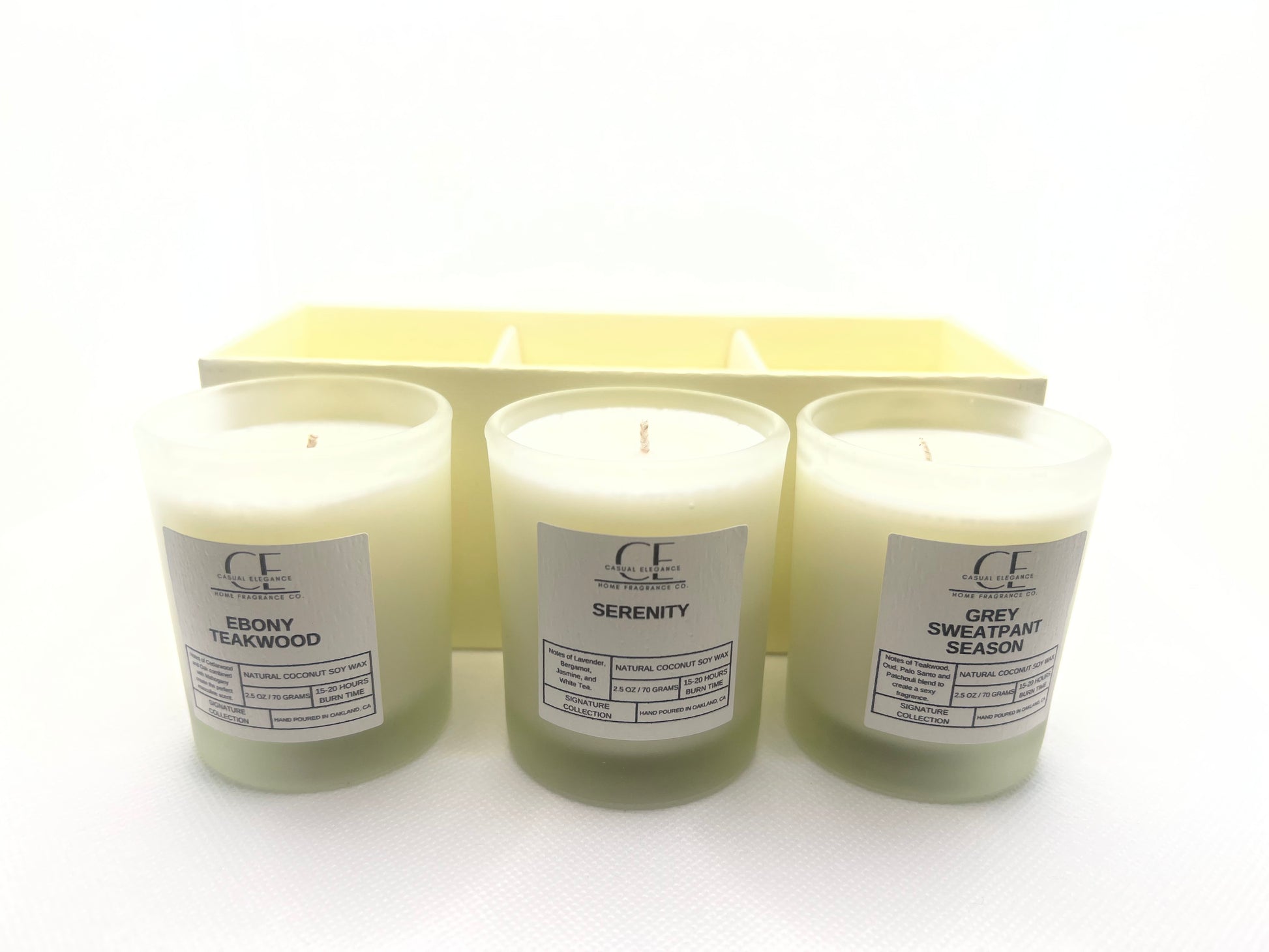 Includes three 2.5 ounce candles from our best selling fragrances collection.